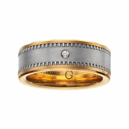 Add striking style to your attire with this men’s band. A stainless steel inlay set in the yellow ceramic band gives it stand-out style, while a tiny diamond accent adds a hint of sparkle.