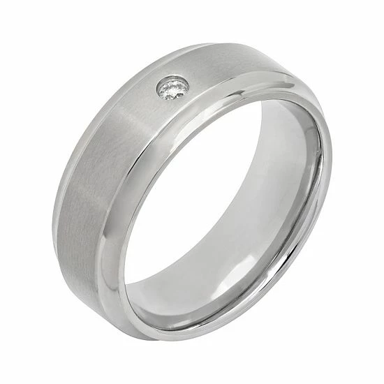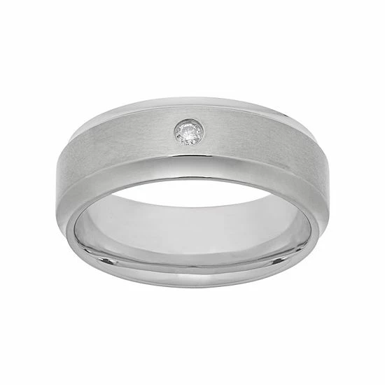 A diamond accent and brushed center give this comfort-fit titanium wedding band a timeless look.