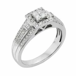 She’ll be speechless when you present her with this stunning halo engagement ring. Four invisible-set, princess-cut diamonds serve as the ring’s focal point, and are beautifully accented by round-cut diamonds and diamond baguettes.