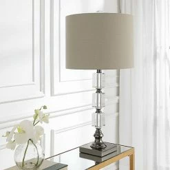 Create an eye-catching focal point in any room with this elegant stacked crystal table lamp.