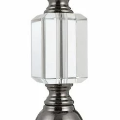 - Elegant table lamp features stacked crystal separated by dark antique nickel accents