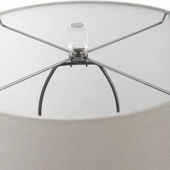 - Round hardback shade is a light taupe linen fabric with light slubbing