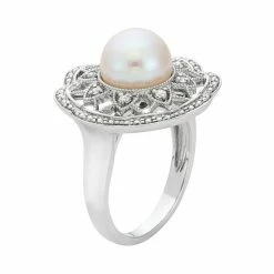 This sterling silver ring is a lovely pick. Its diamond and freshwater cultured pearl floral design gives it feminine beauty, while milgrain accents add eye-catching detail. Comes in a gift box.