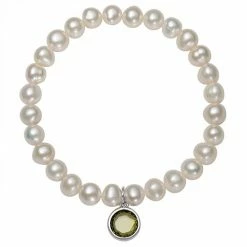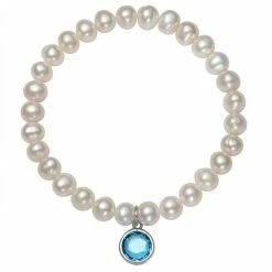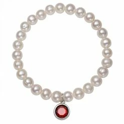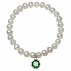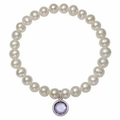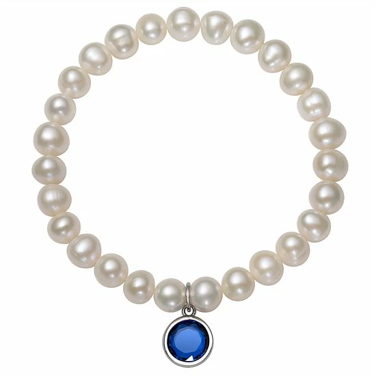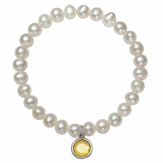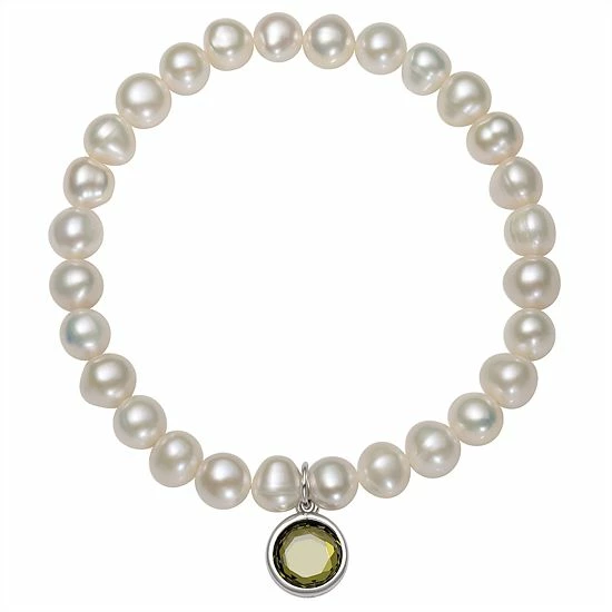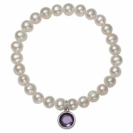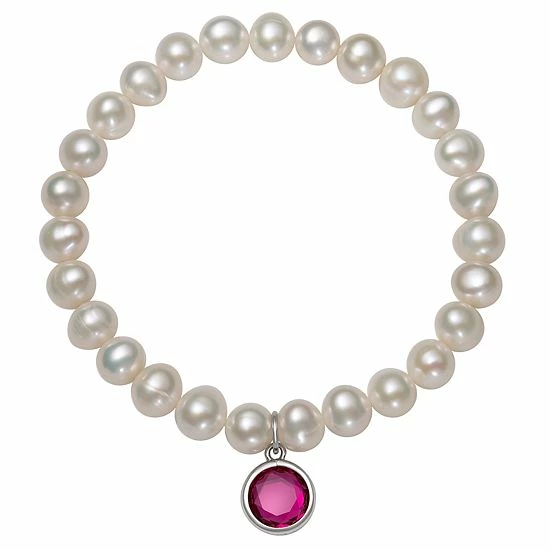 Featuring white freshwater cultured pearls and a birthstone charm, this stretch bracelet is an eye-catching accessory for any occasion.