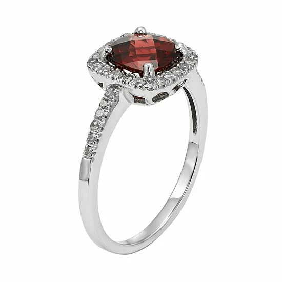 Adorned with a cushion-cut genuine garnet center stone encircled with round-cut diamond accents, this 10k white gold halo ring captivates from every angle.
