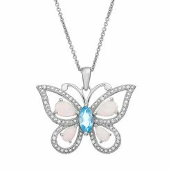 A central marquise-cut genuine Swiss blue topaz stone and pear-shaped, lab-created opals decorate this open-worked butterfly pendant with ornate appeal.