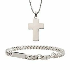 Celebrate your faith with this gold tone ion-plated stainless steel cross pendant necklace and engravable bracelet set.