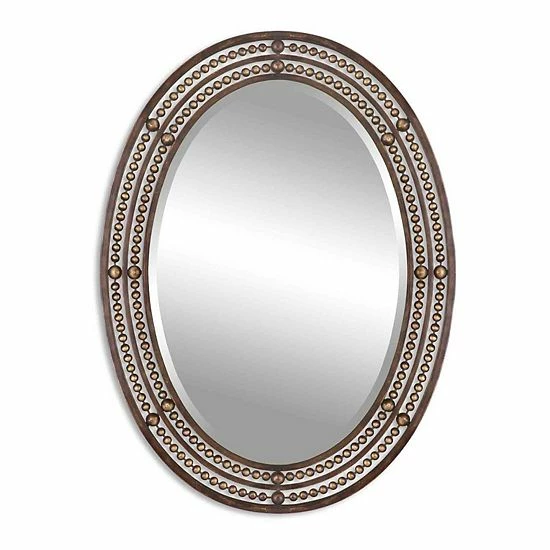 This wall mirror comes with a distressed, oil rubbed bronze finish with antiqued gold highlights.