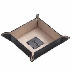 This men’s black leather valet tray is perfect for spare change or your favorite accessories. Monogrammed initial adds a personal touch.