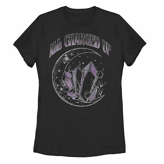 Give your wardrobe a boost with this juniors’ “All charged up” crystals graphic tee.