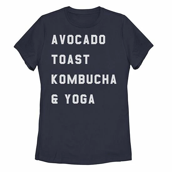 Trendy style abounds on this Juniors’ Avocado Toast Kombucha & Yoga Graphic Tee.
