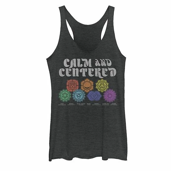 Stay balanced in this juniors’ “Calm and centered” chakra graphic tank top.