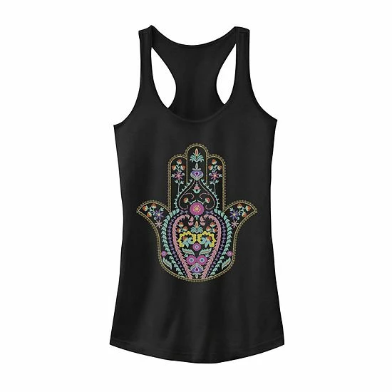 Trendy style abounds on this Juniors’ Colorful Bohemian Hamsa Henna Graphic Tank.