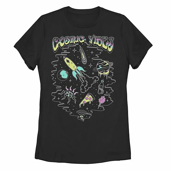 Trendy style abounds on this Juniors’ Cosmic Vibes Doodles Graphic Tee.