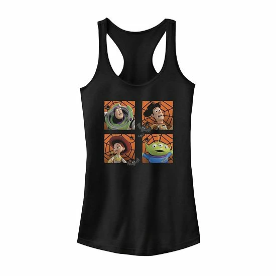 A spooky spiderweb design adds a festive touch to this Toy Story character grid tee.