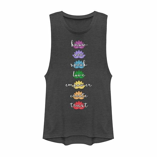 Center yourself with this Juniors’ Fifth Sun Chakra Lotuses Muscle Tee. In charcoal.