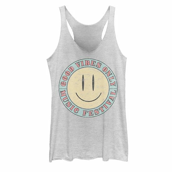 Spread good vibes and groove out in this juniors’ smiley face music festival tank top.