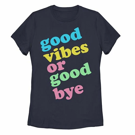 You’ll love the casual look of this juniors’ “good vibes or good bye” graphic tee.