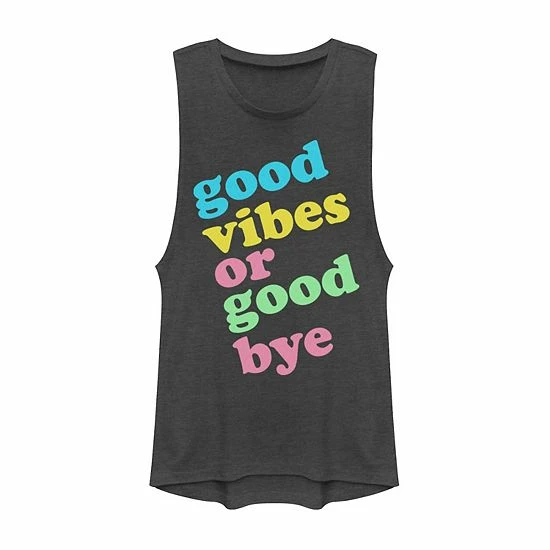 You’ll love the casual look of this juniors’ “good vibes or good bye” muscle tee.