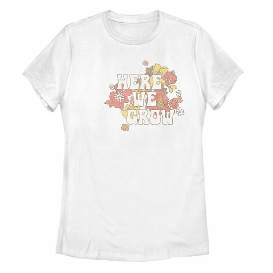 Be ready for anything in this groovy floral “Here We Grow” juniors’ tee.
