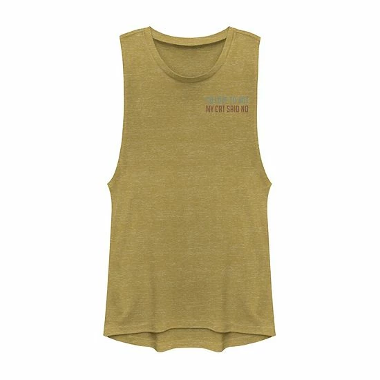 Trendy style abounds on this Juniors’ I’d Love To But My Cat Said No Left Chest Text Graphic Muscle Tee.