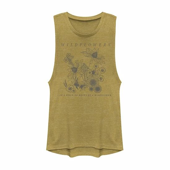 Trendy style abounds on this Juniors’ In A Field Of Roses Be A Wildflower Graphic Muscle Tee.