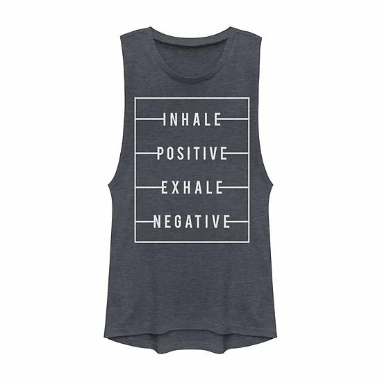 Trendy style abounds on this Juniors’ Inhale Positive Exhale Negative Graphic Muscle Tee.