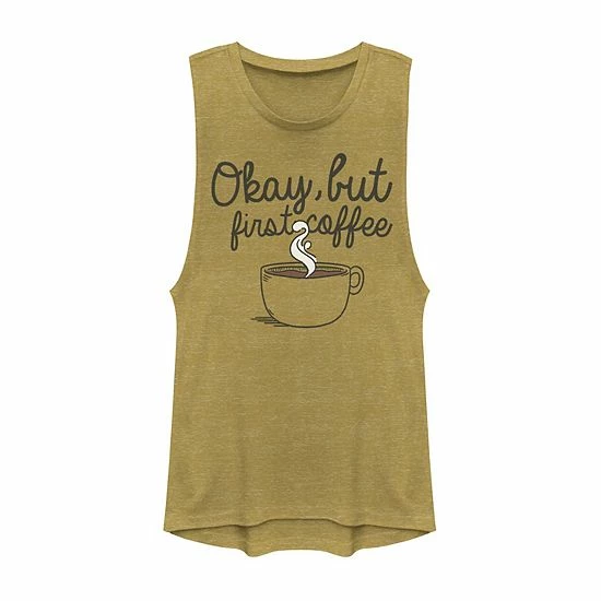 Trendy style abounds on this Juniors’ Okay But First Coffee Graphic Muscle Tee.