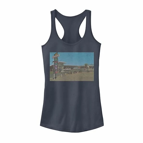 This classic Juniors’ Retro Desert Motel Photograph Tank Top is a must have. In indigo.