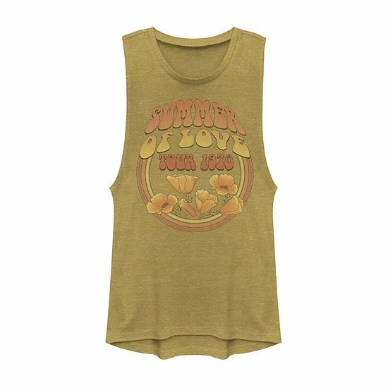 Trendy style abounds on this Juniors’ Summer Of Love Tour 1970 Poppies Graphic Muscle Tee.