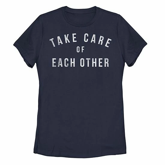 This fashionable juniors’ graphic tee offers an inspirational message to take care of each other. In navy.