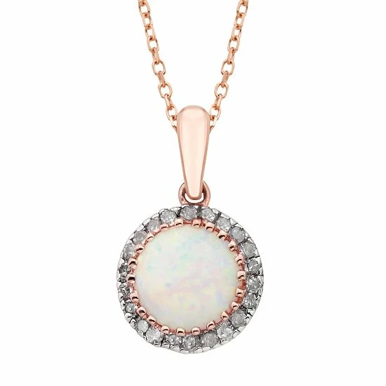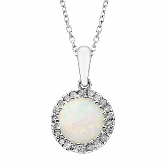 A lab-created opal gemstone surrounded by shimmering diamonds gives this halo pendant unsurpassed beauty.