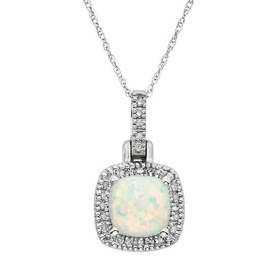 A lab-created opal gemstone surrounded by shimmering diamonds gives this halo pendant unsurpassed beauty.