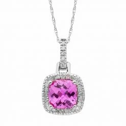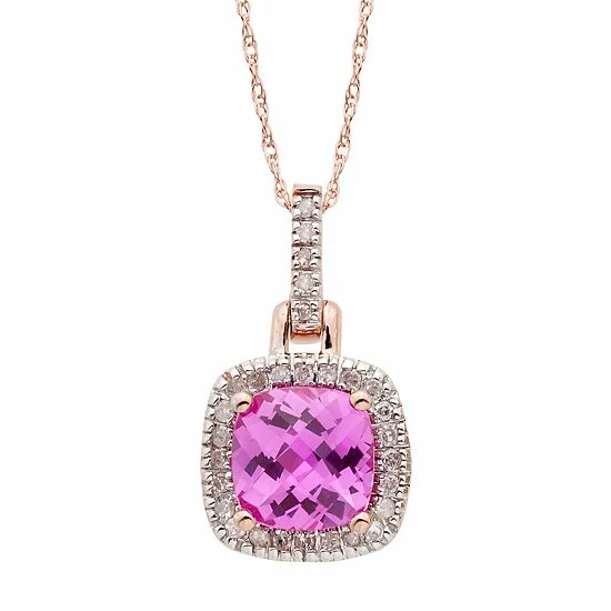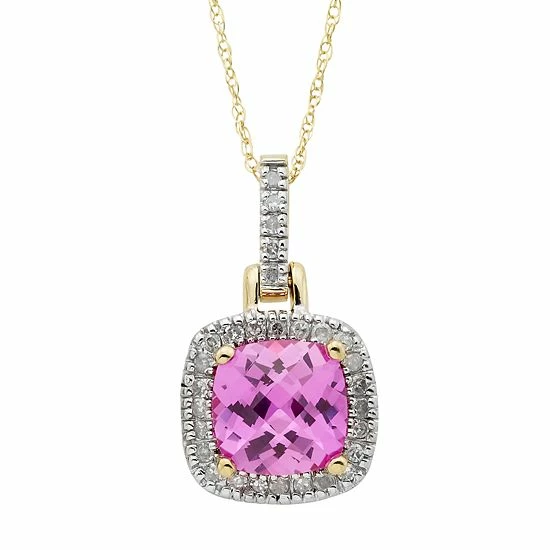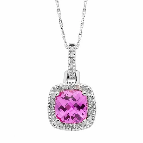 A lab-created pink sapphire gemstone surrounded by shimmering diamonds gives this halo pendant unsurpassed beauty.