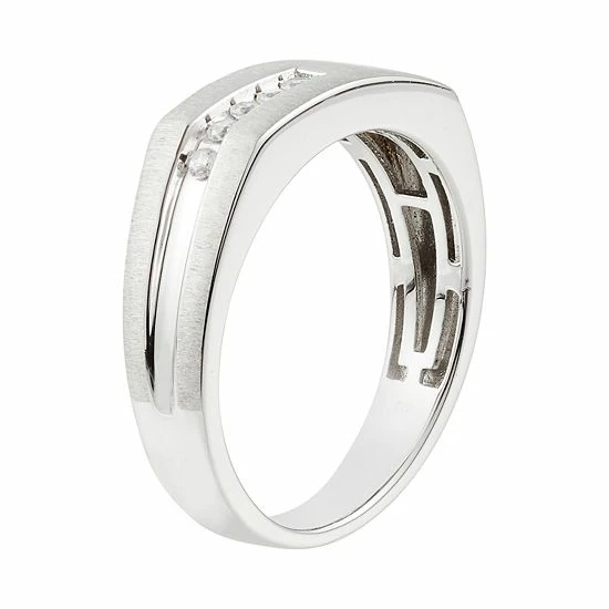 Featuring four pave-set diamonds and a satin finish, this 10k white gold ring offers distinctive style.