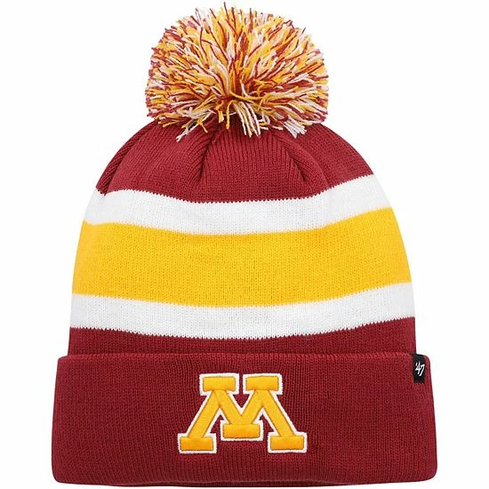 Keep your head warm in vibrant fashion with this Minnesota Golden Gophers Breakaway cuffed hat from ’47. It features a raised Minnesota Golden Gophers logo embroidered on the front and a knit design in colors that coordinate with the fluffy pom. Additionally, fleece lining provides an extra layer of softness and coziness.