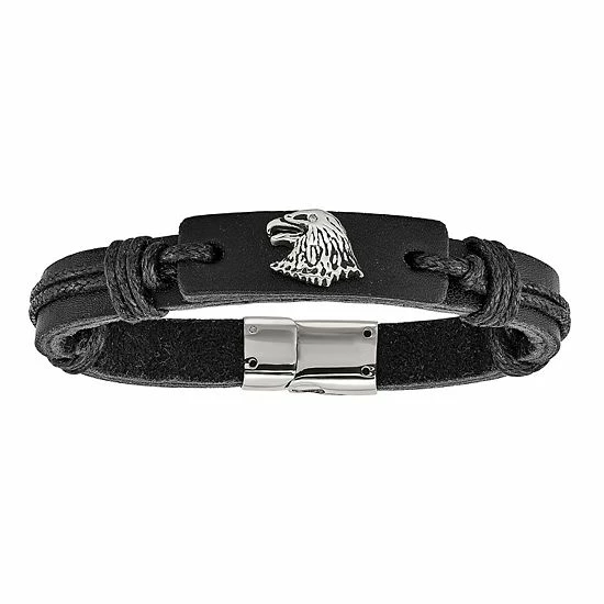 Set your style soaring when you add this bold black leather eagle bracelet to your look.