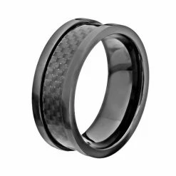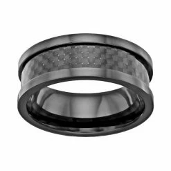 A carbon fiber inlay makes this men’s black ceramic band a masculine choice.