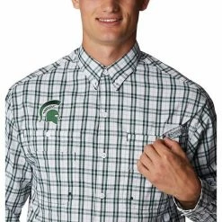 Enhance your fishing trips or outdoor adventures with the incredibly functional and comfortable Super Tamiami button-down shirt from Columbia. Featuring an embroidered Michigan State Spartans logo, it uses Omni-Shade technology to provide maximum sun protection for long hours, breathable Omni-Wick fabric to evaporate away moisture quickly and mesh-lined venting for a cooling breeze. Plus, a rod holder loop and multiple pockets keep your hands free. As the finishing touch, a classic gingham pattern in Michigan State Spartans colors creates a professional look.