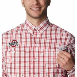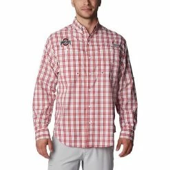 Enhance your fishing trips or outdoor adventures with the incredibly functional and comfortable Super Tamiami button-down shirt from Columbia. Featuring an embroidered Ohio State Buckeyes logo, it uses Omni-Shade technology to provide maximum sun protection for long hours, breathable Omni-Wick fabric to evaporate away moisture quickly and mesh-lined venting for a cooling breeze. Plus, a rod holder loop and multiple pockets keep your hands free. As the finishing touch, a classic gingham pattern in Ohio State Buckeyes colors creates a professional look.