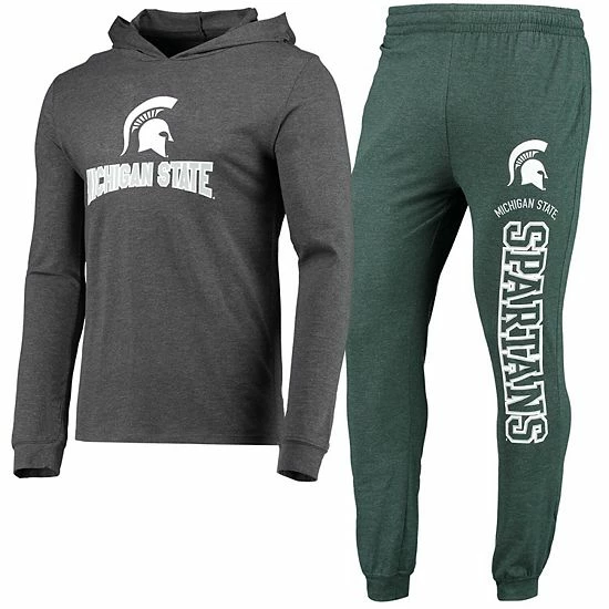 When cooler temperatures hit, kick back while you stay warm in this Michigan State Spartans Meter Hoodie T-shirt and jogger pants set. It features the official Michigan State Spartans logo printed above the team name on both pieces. An elastic waistband also provides a flexible fit for added comfort.