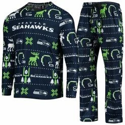 Get in the spirit this season with this set of Seattle Seahawks Ugly pajamas from FOCO. Both the top and bottoms are covered in festive, team-inspired graphics – from snowflakes to reindeer to helmets. With soft material, these pajamas are sure to be a nighttime favorite as you rest up before the next Seattle Seahawks game.