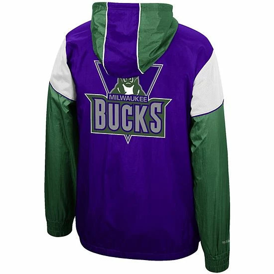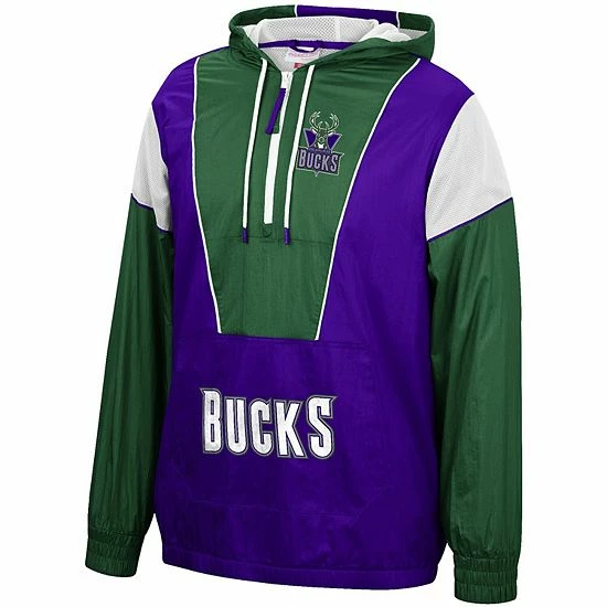 Put your loyalty to the Milwaukee Bucks on full display by sporting this Highlight Reel Windbreaker jacket from Mitchell & Ness. It features noticeable Milwaukee Bucks graphics printed on the front and back, an adjustable hood and mesh lining for a breathable feel. The half-zip closure also helps you maintain the perfect temperature in this Hardwood Classics hoodie.