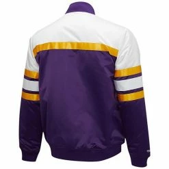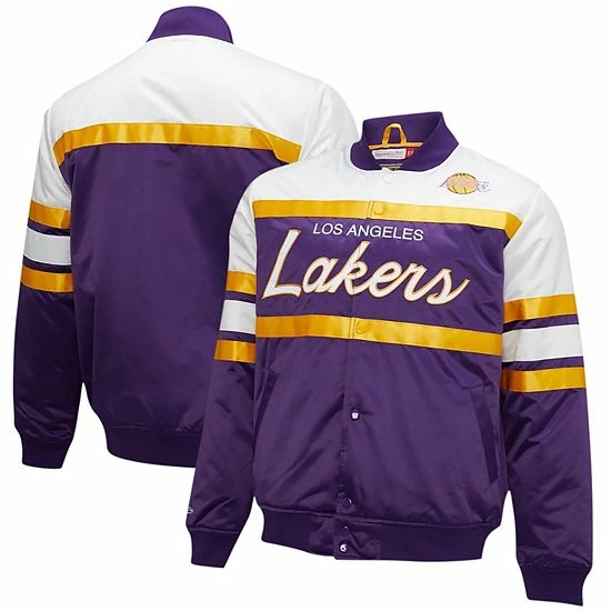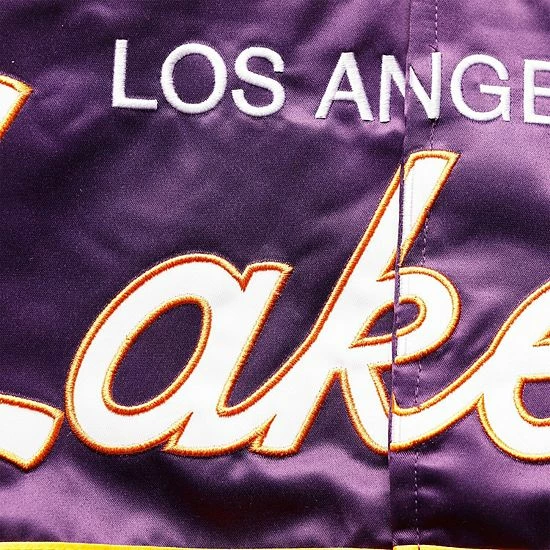 When the weather cools, gear up in Los Angeles Lakers style with this Mitchell & Ness Script jacket. Featuring throwback team graphics with matching stripes, this full-snap has a sleek satin finish. Add a timeless touch to any outfit with this classic Los Angeles Lakers jacket.