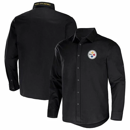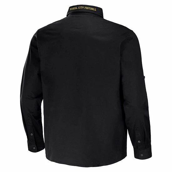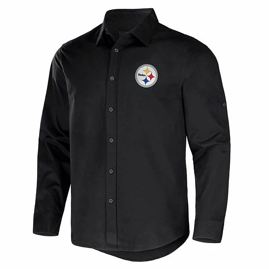 Add an exciting piece of Pittsburgh Steelers apparel to your rotation with this Convertible Twill button-up shirt from NFL x Darius Rucker Collection by Fanatics. Whether you choose to wear it as a long sleeve top or button up the sleeves, you’ll be representing the the Pittsburgh Steelers in style. The team’s logo on the chest and their iconic catchphrase across the back of the collar will help get you pumped up for game day.