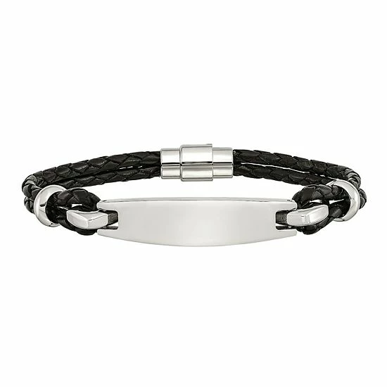 Featuring a stainless steel ID plate connected to braided black leather straps, this men’s bracelet is a handsome accent to your look.