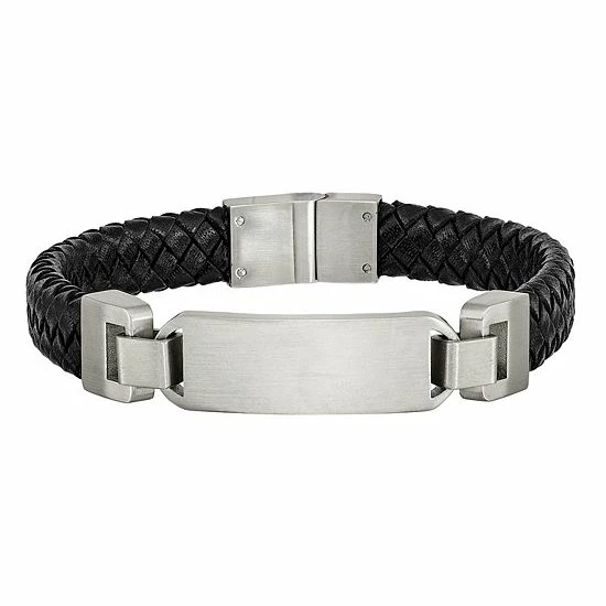 Featuring a stainless steel ID plate and braided black leather straps, this men’s bracelet is a handsome accent to your look.