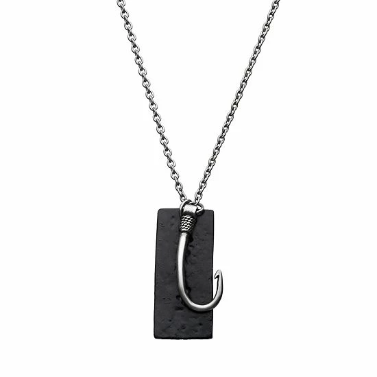 This stainless steel black tag fish hook pendant necklace is the perfect accessory for any cool fisherman.