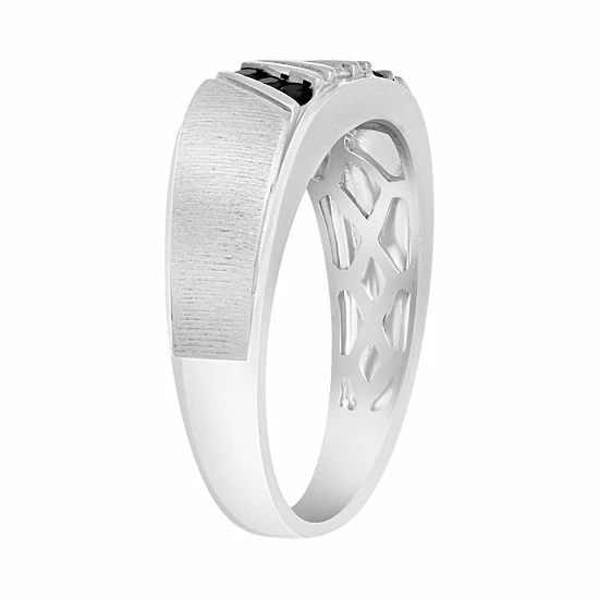 Diagonal rows of alternating white and black diamonds give this men’s sterling silver ring bold appeal.
