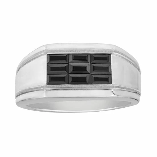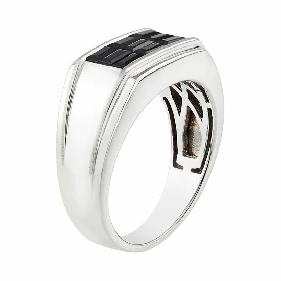Three rows of black sapphire baguettes make this men’s sterling silver ring a bold and unique choice.